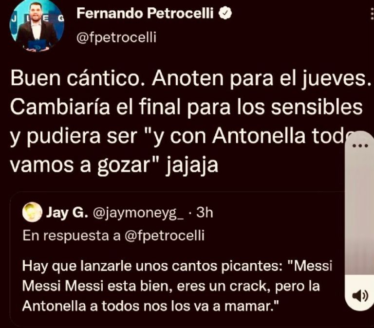 “Hay que lanzarle uno cantos picantes: ´Messi, Messi, Messi, está bien, eres un crack, perp la Antonnella, todos nos la vamos a mamar”, fue el comentario del tuit, a lo que Petrocelli lo determinó como un “buen cantico” y además le añadió y cambió el final; “para los sensibles, y con Antonnella todos vamos a gozar”.