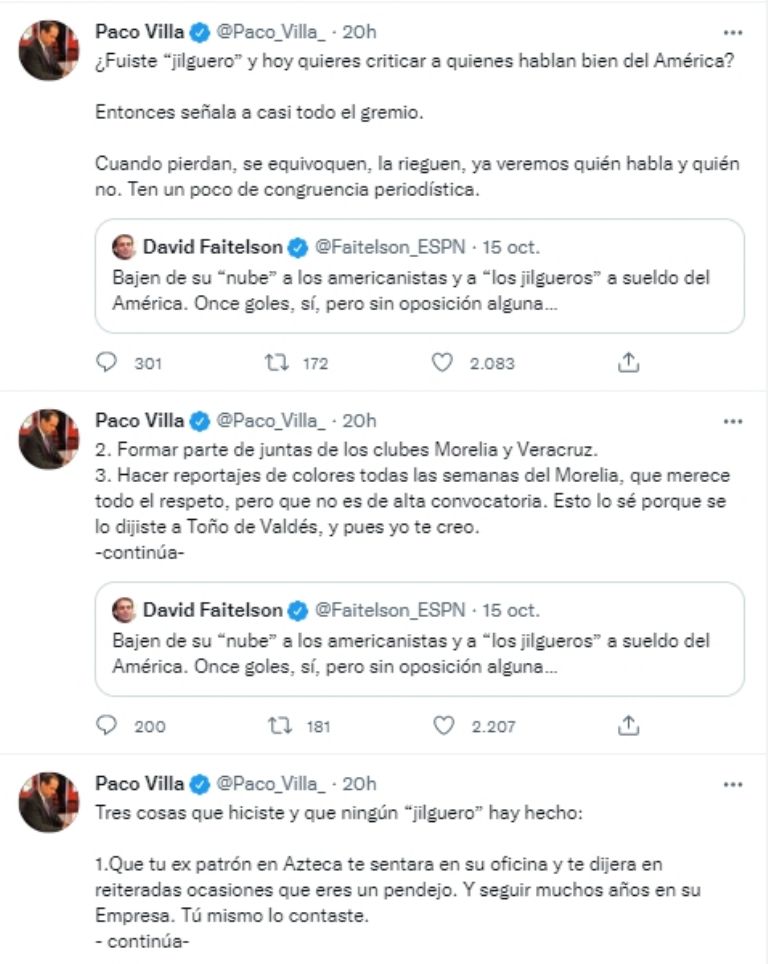 La respuesta de Paco Villa llegó al día siguiente cuando retomó el tweet de su compañero de profesión para dar a conocer tres cosas que él hizo cuando formaba parte de Azteca Deportes: aceptar los insultos de su jefe y permanecer en la empresa, formar parte de juntas de equipos como Veracruz y Morelia y, finalmente, hacer reportajes de color de Monarcas aún y cuando su convocatoria en México nunca fue elevada.