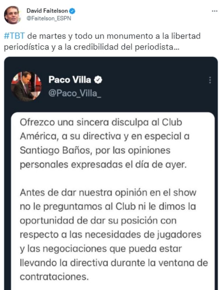 Como era de esperarse, el gancho de David Faitelson no tardó en llegar. El comentarista fue claro en colocar una captura de pantalla en donde se muestra la disculpa pública que Paco Villa ofreció a Santiago Baños después de la crítica que este hizo por su trabajo en el club, hecho que muchos aficionados indican fue “obligado” a hacer en función de la relación existente entre las Águilas y TUDN.