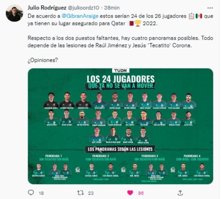 Gibrán Araige, reportero de TUDN que cubre al combinado tricolor, se presentó en el programa Línea de 4 para mostrar a los jugadores que están contemplados por el entrenador argentino para el evento que se llevará a cabo entre el 20 de noviembre y el 18 de diciembre y que únicamente saldrían de la lista por alguna lesión de gravedad.