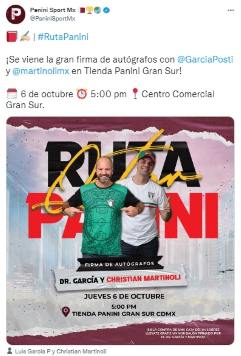 En la cuenta oficial de redes sociales de Panini Sports México, se dio a conocer que Christian Martinoli y Luis García estarán presentes este jueves 6 de octubre en una plaza comercial del sur de la Ciudad de México. Será en punto de las 17:00 horas, tiempo del centro.
