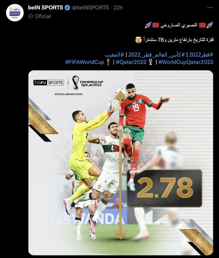 Ahora catalogado como el héroe africano, no solo eliminó a Portugal, sino que aplastó una marca que el mismo Cristiano Ronaldo habría alcanzado de manera histórica con un salto de 2,5 metros y que ahora estaba siendo arrebatado por el marroquí con un cabeceo de 2,78 metros de altura, esto de acuerdo a la información presentada por beIN SPORTS.