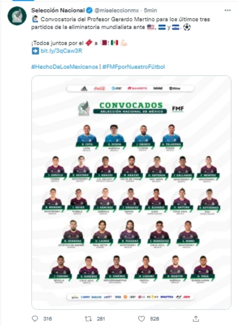 Luego de ser duramente cuestionado tras dejar fuera de su última convocatoria a Javier Chicharito Hernández, ahora Tata Martino sorprendió nuevamente con su lista rumbo a los últimos juegos eliminatorios de la Selección Mexicana con miras al Mundial de Qatar 2022.