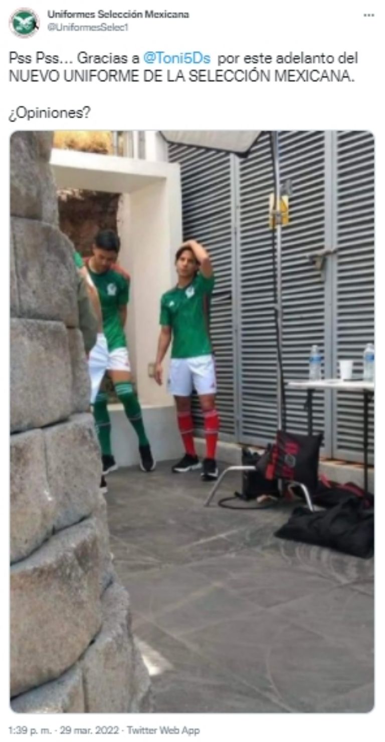 El primero en revelar esta nueva indumentaria en Twitter fue Antonio Lozano, quien publicó una fotografía en donde Alfredo Talavera (Diablos Rojos del Toluca) y Diego Lainez (Real Betis) figuran esta playera que será en su mayoría verde con short blanco, por lo que las calcetas podrán ser verdes o rojas dependiendo el uniforme del rival.