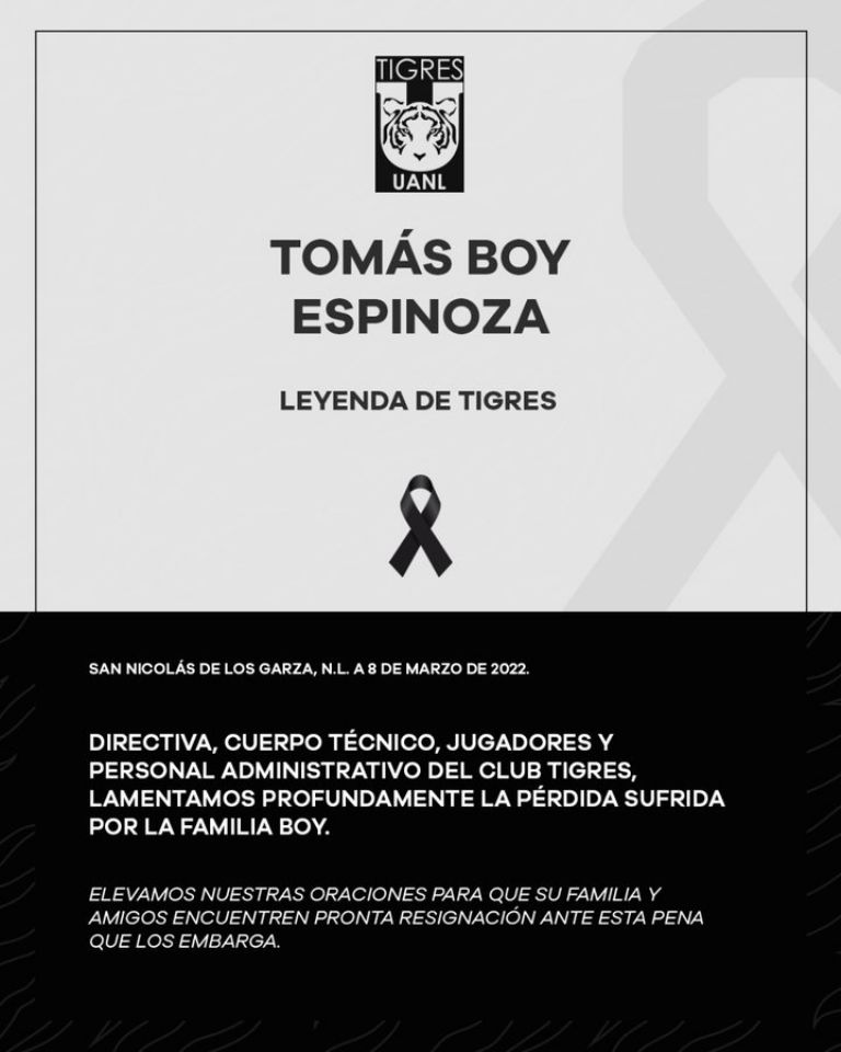 Una tromboembolia pulmonar terminó con la vida de Tomá Boy, El Jefe, histórico jugador de los Tigres de la UANL que por mucho tiempo fue histórico goleador de los felinos. Capitán de la Selección Mexicana que jugó el Mundial del 86', donde jugó aquel quinto partido contra Alemania. En el norte le lloran a su ex capitán. En redes sociales el club universitario le dedicó un emotivo adiós.