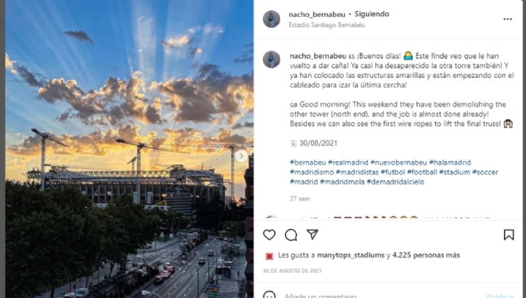Pero el corazón se rompió al separarse del estadio que aún mantiene cielos abiertos y maquinaria pesada para trabajar lo que será el techo retractil. No pudo terminar la obra, pero su perfil de Instagram, donde compartía las imágenes del proceso (@nacho_bernabeu), llegó a lugares inimaginados por mostrar a detalle los avances de dicha obra. El centinela del estadio madrileño no dejaba de vigilar celosamente a un amor del que ahora está lejos.