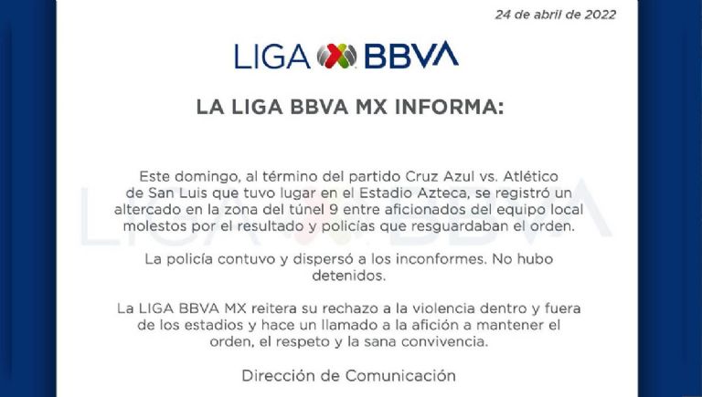 “Este domingo, al termino del partido Cruz Azul vs Atlético de San Luis que tuvo lugar en el Estadio Azteca, se registró un altercado en la zona del túnel 9 entre aficionados del equipo local por el resultado y policías que resguardan el orden. La policía contuvo y dispersó a los inconformes. No hubo detenido”, explica el comunicado de la Liga MX.