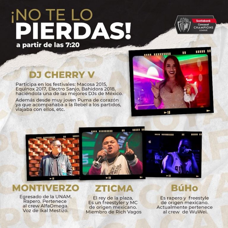 En punto de las 19:20 horas dará inicio el show con Dj Cherry V, Montiverzo, Zticma y BúHo, quienes serán los encargados de empezar a poner el ambiente en Ciudad Universitaria tras volver a disputar una final internacional luego de 17 años de ausencia.