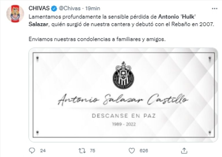 Las Chivas del Guadalajara, y el futbol mexicano en general, están de luto. En los últimos minutos se dio a conocer el terrible fallecimiento de Antonio, Hulk Salazar, exfutbolista profesional mexicano que defendió los colores del equipo rojiblanco y que habría perdido la vida después de haber sido calcinado en Jalisco.