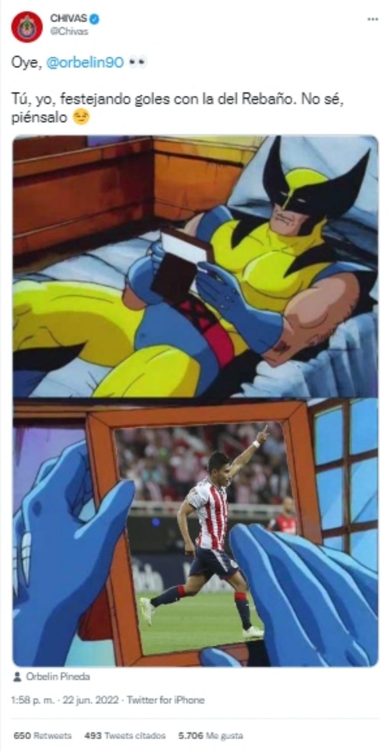 Aprovechando el auge que tienen en las redes sociales, Chivas decidió publicar una imagen en su cuenta de Twitter misma en la que aparece una foto de Orbelín Pineda con la camisa del 12 veces campeón del futbol mexicano junto a la siguiente leyenda: “Oye, Orbelín… Tú, yo, festejando goles con la del Rebaño. No sé, piénsalo”.