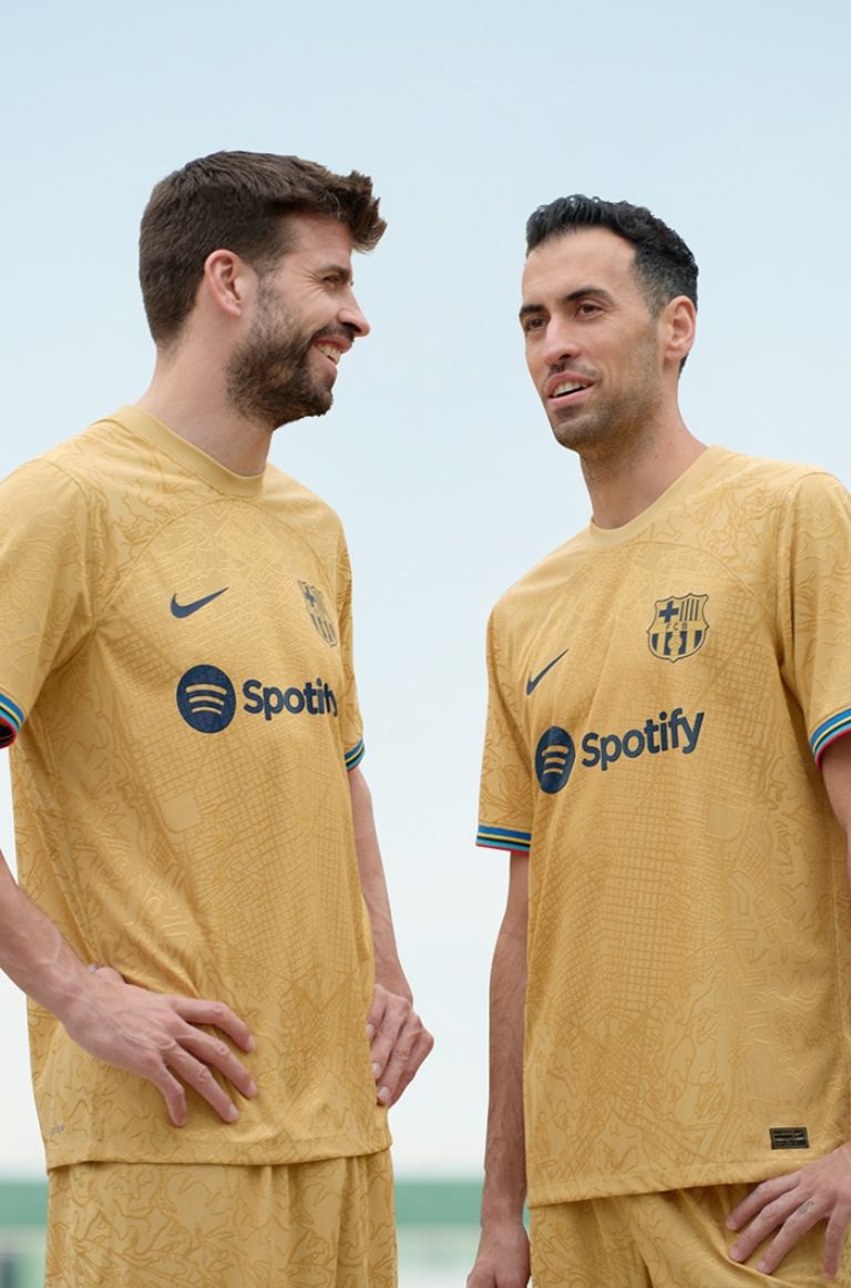 La de visitante también hace homenaje a los JJOO, apostando por un diseño en que el color dorado es el protagonista absoluto e incorpora la trama del mapa de Barcelona en la que se identifican el Eixample, Montjuic y la Barceloneta, a la vez que remata las mangas con un ribete con los colores de los cinco aros olímpicos.