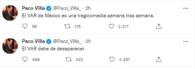 Paco Villa fue uno de los comentaristas que estuvo presente en el Estadio Azteca para narrar las acciones del encuentro en la primera mitad, mientras que en la parte complementaria quien tomó los micrófonos fue Raúl Pérez. Las acciones más polémicas, curiosamente, se dieron en los últimos 20 minutos del partido; sin embargo, lo anterior no eximió el hecho de que el narrador mostrara su furia por el uso del VAR.