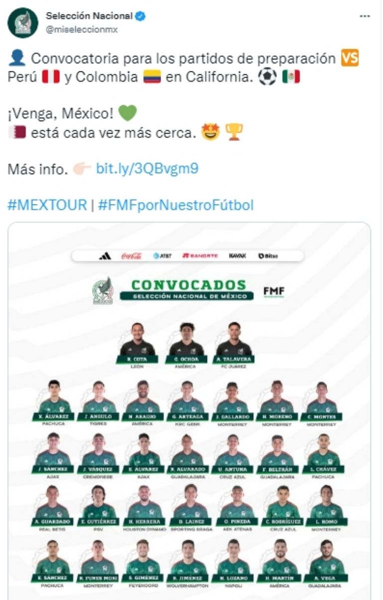 La Selección Mexicana de Futbol, liderada por el técnico Gerardo, el Tata Martino, ha revelado una convocatoria llena de sorpresas para los juegos amistosos que el TRI sostendrá ante Perú y Colombia como parte de los duelos de preparación rumbo al Mundial de Qatar 2022, el cual iniciará el próximo domingo 20 de noviembre.