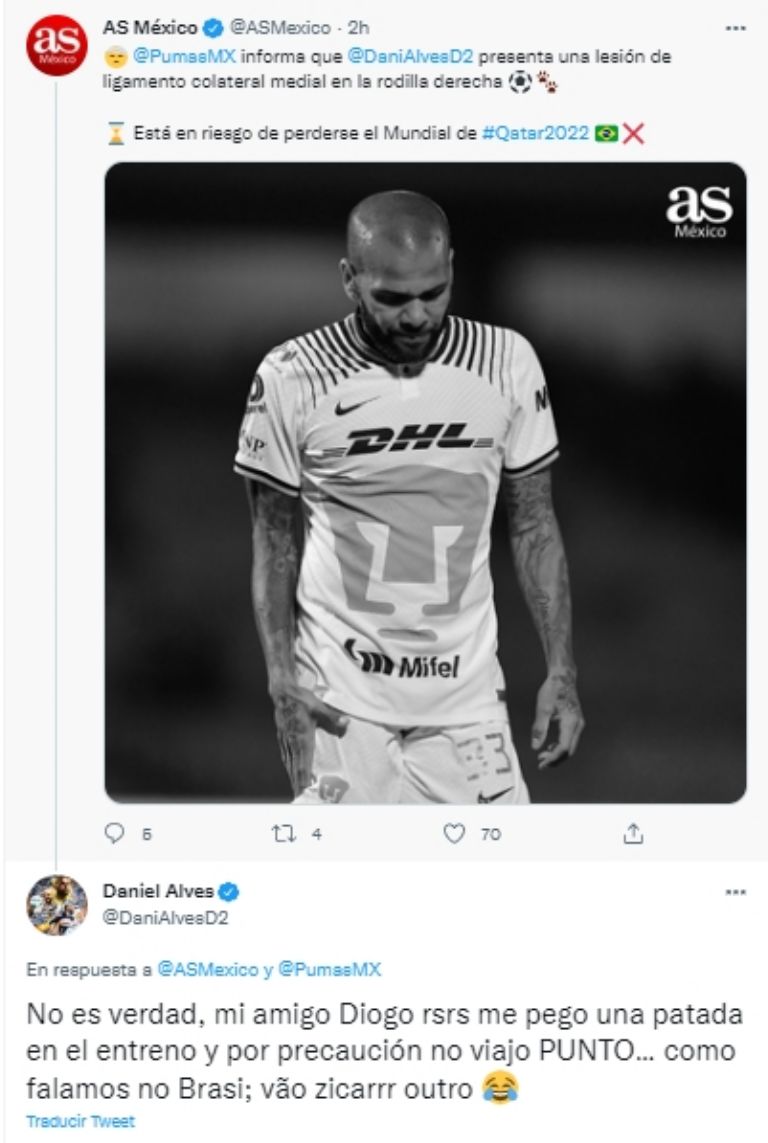 La lesión de Dani Alves presentada por Pumas hizo que varios medios nacionales compartieran su estatus a través de sus principales redes sociales. Uno de ellos fue As, quien confirmó lo dicho por el equipo y que, por ende, puso en entredicho la participación del carioca con su Selección en el Mundial de Qatar 2022.