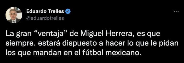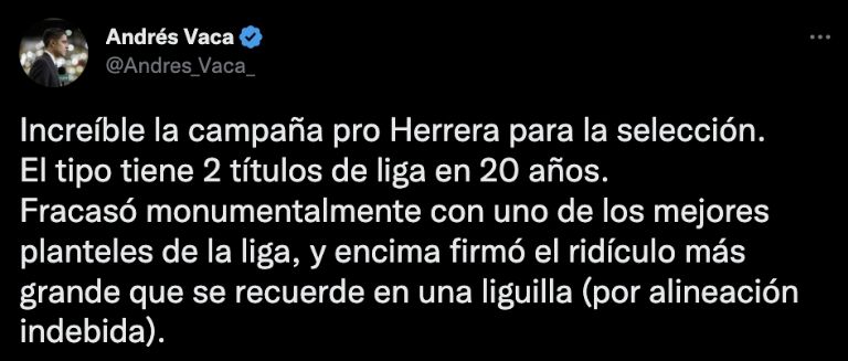 “Increíble la campaña pro Herrera para la selección. El tipo tiene 2 títulos de liga en 20 años. Fracasó monumentalmente con uno de los mejores planteles de la liga, y encima firmó el ridículo más grande que se recuerde en una liguilla (por alineación indebida)”, “Sus últimos años han sido de los peores: fracaso tras fracaso. Con Tigres no pudo llegar ni a una final (con un plantel de campeonato) y salió peleado con sus jugadores”, “Sumado a eso, sus últimas temporadas con el América fueron una lágrima”, puntualizó.