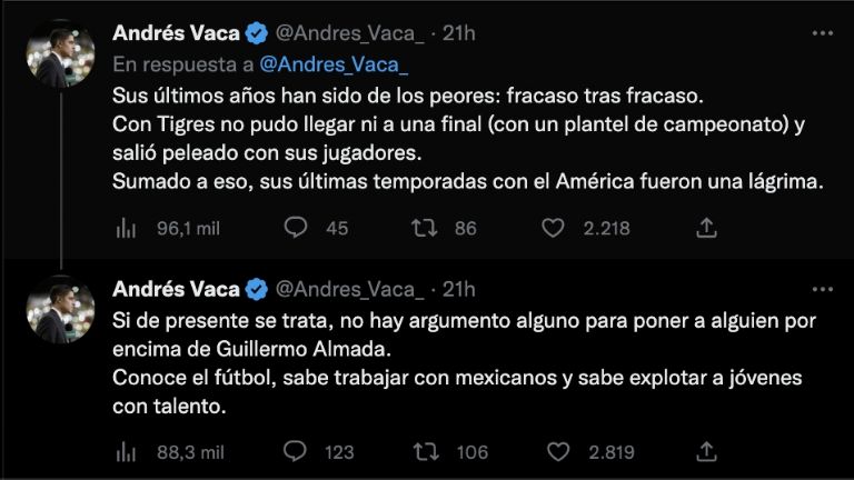 Pese a esto, no sería el único comunicador que compartiría su pensamiento respecto al posible regreso del Piojo a la Selección y otro que alzaría la voz, sería Andrés Vaca, quien no solo se mostró en contra del estratega, también le recordó la gran cantidad de fracasos que ya acumulaba, los pocos títulos que había conseguido y que ni siquiera estableció una voz de mando cuando estuvo en el plantel regio montano.