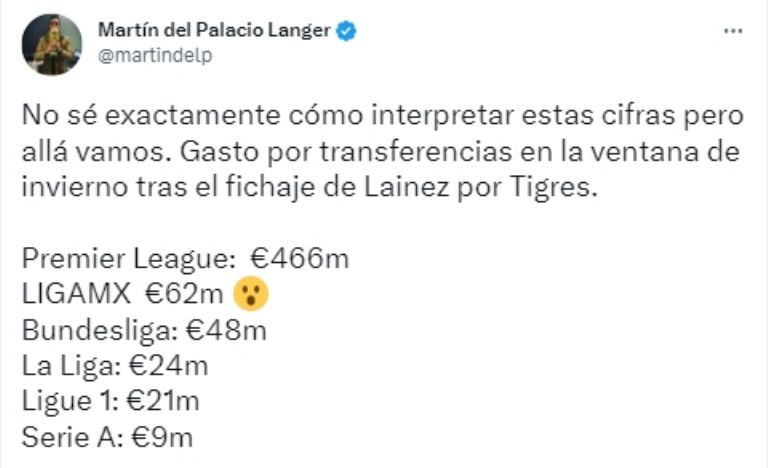 Martín del Palacio, periodista mexicano que radica en Europa y que es experto tanto en futbol como en la NFL, reveló una lista con las Ligas más importantes del viejo continente en comparación con lo ocurrido a la Liga MX, misma en la que, si se suma el regreso de Diego Lainez, habría invertido un total de 62 millones de euros hasta ahora.