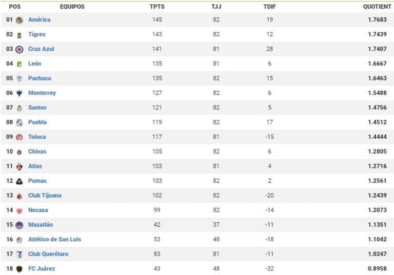 Después de cuatro fechas disputadas del torneo Clausura 2023, la Liga MX se encuentra de la siguiente forma. En el último lugar de la tabla de cociente aparecen los Bravos de Juárez, mientras que en el puesto 17 se vislumbran los Gallos Blancos del Querétaro y en el antepenúltimo sitio aparece el Atlético de San Luis.