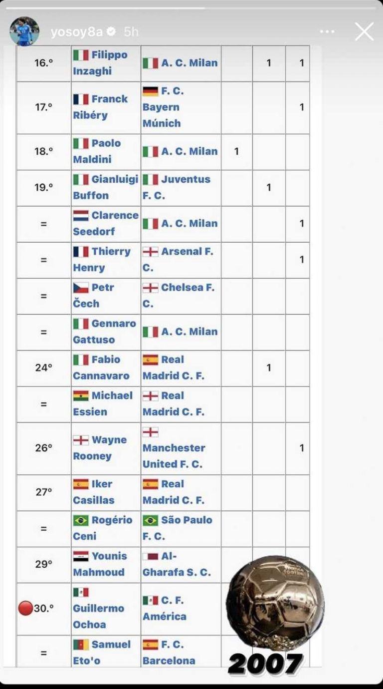 Orgulloso, el portero de la Selección Mexicana compartió en sus redes sociales la lista de competidores por el Balón de Oro del ya lejano 2007, donde como portero de las Águilas del América quedó en la posición 30, en tanto que Inzaghi terminó en la posición 16 en las votaciones cuando militaba en el AC Milan, que tras derrotar al Liverpool en el Estadio Olímpico de Atenas ese año ganó la Champions League.