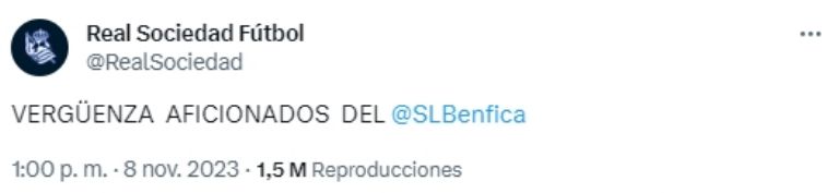 Derivado del video de la golpiza que le dio la vuelta al mundo, además del lanzamiento de bengalas por parte de los espectadores del Benfica hacia los de la Real Sociedad, la directiva Txuri-Urdinak condenó los hechos. Mediante Twitter, envió un mensaje contundente: advirtió que deberían tener vergüenza por lo sucedido.