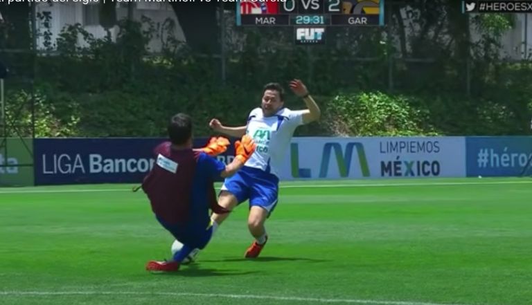 La jugada se dio en el minuto 29 cuando el Warrior quedó mano a mano contra López quien era el portero, pero salió como Jorge Campos y le levantó la pierna a la altura de las partes nobles del conductor estrella del Survivor México.