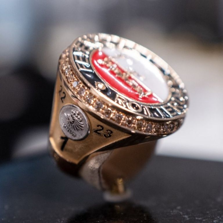 Luego de rechazar una jugosa oferta del Liverpool y al sacarle 10 puntos de ventaja a su más cercano perseguidor, el PSV Eindhoven, Santiago Giménez y el Feyenoord, que confirmó además que se quedará con el delantero mexicano por una o varias temporadas más, amarró así este nuevo campeonato de la Eredivisie, que corona con estos anillos que muestran el logo del club con diamantes incrustados y están personalizados con los nombres y dorsales de todos y cada uno de sus jugadores.