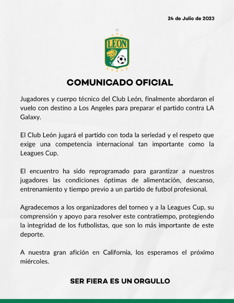 De tal modo y tras el oso sufrido, la Leagues Cup reprogramó el duelo LA Galaxy vs León que se iba a jugar este martes 25 de julio al miércoles 26 de este mismo mes a las 19:30 horas en el Dignity Health Sports Park: “Agradecemos profundamente al León, a sus jugadores, cuerpo técnico y a los todos los integrantes de la delegación por su paciencia”, se disculpó Víctor Guevara, vicepresidente de competiciones de la Leagues Cup.