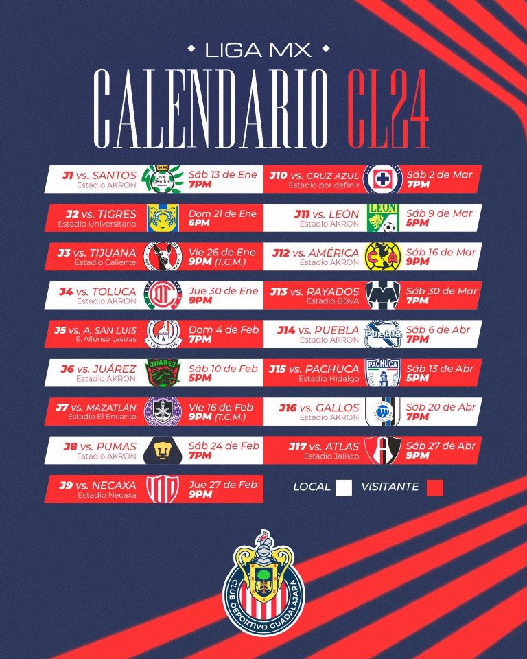 Para ello también será fundamental el resultado que obtengan ante el odiado rival, las Águilas del América, ante las que se enfrentarán el sábado 16 de marzo a las 21 horas, en actividad de la fecha 12 también en el Estadio Akron, mientras que el Clásico Tapatío lo enfrentarán ante los Rojinegros del Atlas el sábado 27 de abril a las 21 horas en el Estadio Jalisco, en la última fecha del calendario que aquí te traemos completo.