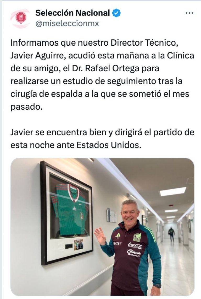"Informamos que nuestro Director Técnico, Javier Aguirre, acudió esta mañana a la Clínica de su amigo, el Dr. Rafael Ortega para realizarse un estudio de seguimiento tras la cirugía de espalda a la que se sometió el mes pasado. Javier se encuentra bien y dirigirá el partido de esta noche ante Estados Unidos", informó la Selección Mexicana en sus redes sociales para poner fin a la incertidumbre alrededor del Vasco.
