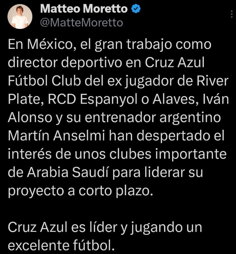 De acuerdo con Matteo Moretto, periodista del medio Relevo, en Arabia Saudita hay interés de un club millonario para que Martín Anselmi e Iván Alonso lideren un proyecto a corto plazo. Si bien no se menciona de cuál equipo se trata, todo indica que el desempeño de ambos al frente Cruz Azul no ha pasado desapercibido fuera de México. Este posible movimiento sería un golpe doloroso para la afición, la cual se ha vuelto a unir con los cementeros.