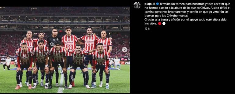 “Termina un torneo para nosotros y toca aceptar que no hemos estado a la altura de lo que es Chivas. Ha sido difícil el camino pero nos levantaremos y confío en que ya vendrán las buenas para los Chivahermanos. Gracias a la barra y afición por el apoyo todo este año ha sido increíble”, fue el sorpresivo mensaje de Piojo Alvarado en su cuenta de Instagram después de la sorpresiva eliminación a manos del Atlas.