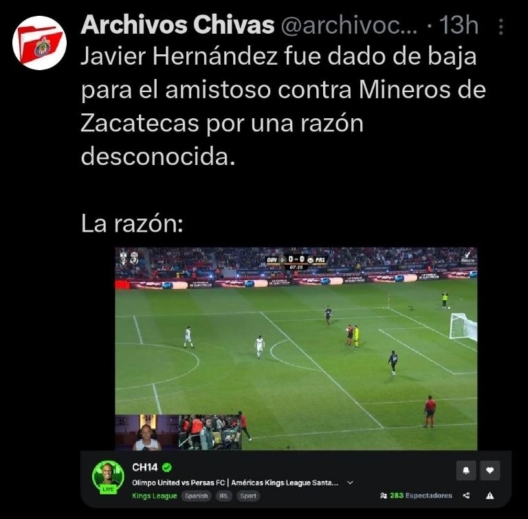 Chivas ya se encuentra en la pretemporada de cara al Clausura 2025 que arranca el próximo 10 de enero, pero lo hace sin la presencia de Chicharito Hernández. El delantero mexicano no estuvo en el amistoso contra Mineros de Zacatecas por una presunta ‘gripa’, aun así, festejó y lloró tras el título de Olimpo United en la Kings League Américas. Esta aparición provocó que los fanáticos del Rebaño Sagrado explotaran en las redes sociales.