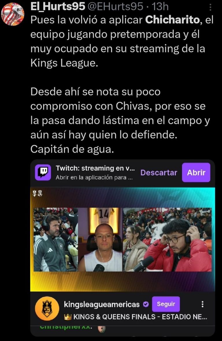 Con mensajes como “la volvió a aplicar”, “se nota su poco compromiso”, “es una falta de respeto a Chivas”, entre otros, fanáticos del Rebaño Sagrado explotaron contra Chicharito Hernández tras aparecer en la final de la Kings League Américas. Los rojiblancos se midieron a Mineros de Zacatecas en busca de llegar en la mejor forma posible al Clausura 2024, el encuentro quedó 0-0 y se espera CH14 reporte en cuanto se recupere de su enfermedad.