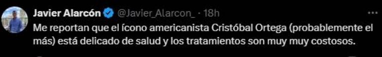 Fue el periodista Javier Alarcón quien en sus redes sociales informó acerca del estado de salud de la leyenda del América: “Me reportan que el ícono americanista Cristóbal Ortega (probablemente el más) está delicado de salud y los tratamientos son muy muy costosos”. El reporte conmocionó a los fans azulcremas, a unas horas de su publicación ya registra más de 2 mil me gusta, 200 repost, 100 comentarios y varias oraciones.