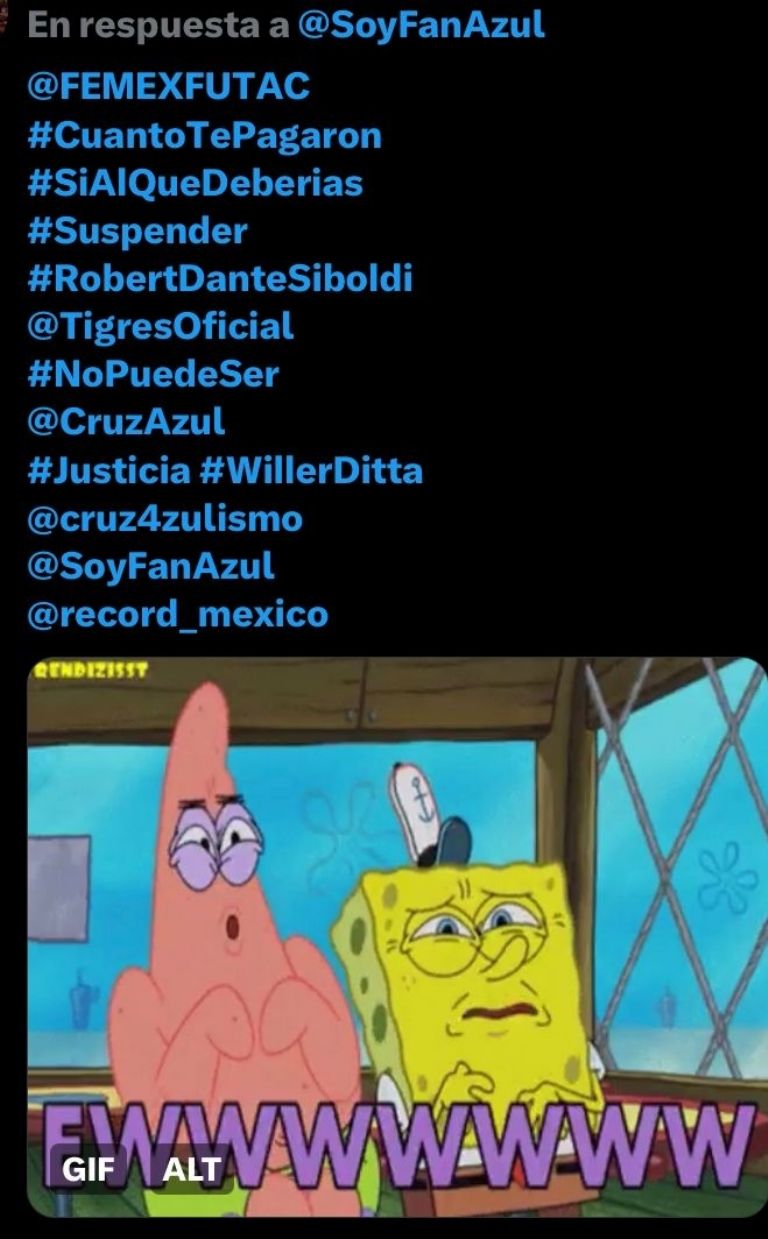 Por otro lado, las posturas de los aficionados celestes en las redes sociales exigen un castigo para Dante Siboldi, quien desde que ingresó al campo de juego tomó por la fuerza a varios jugadores Celestes, posteos como: "Afición Cruz Azul explota y toma como "exagerada" la sanción a Ditta", mientras que otros, aseguran que también fue un tema de racismo y exigen a la FIFA que se investigue como tal dicha situación, mientras que al DT de Tigres no le han impuesto un tipo de sanción.