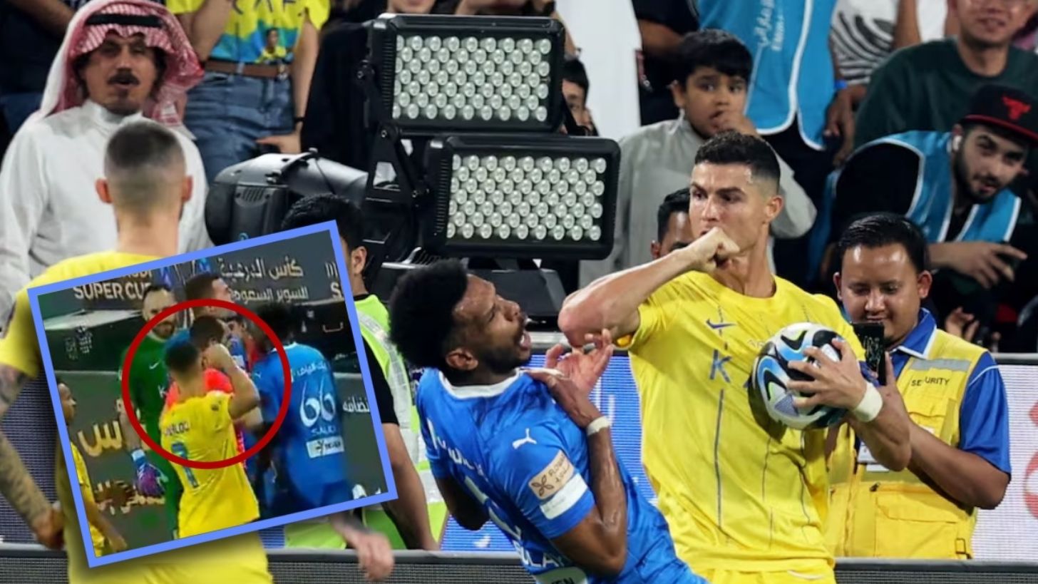 El clásico entre los dos equipos más populares de la Liga Profesional Saudí encendió los ánimos en el terreno de juego, luego de que Cristiano Ronaldo quiso cobrar rápido un saque de banda por izquierda a favor del Al-Nassr, pero el futbolista del Al-Hilal, Saud Abdulhamid, mañosa y tramposamente se lo impidió, por lo que comenzaron los jaloneos entre ambos.