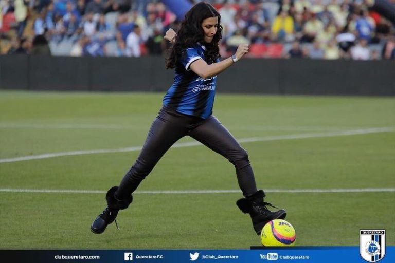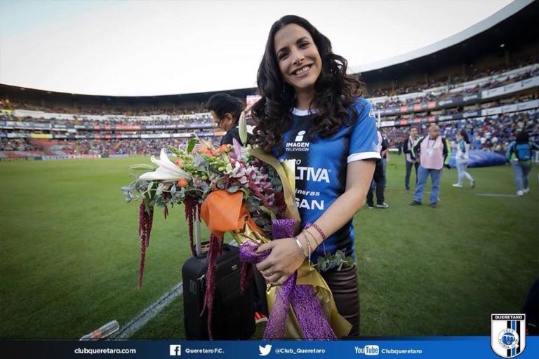 En sus redes sociales, la misma actriz y conductora compartió los momentos que vivió aquella tarde-noche en la casa de los Gallos Blancos del Querétaro, incluso con fotos en las que se le ve a punto de patear un balón, que sus propios sobrinos le advirtieron que nunca lo dejara de ver: “¿Se imaginan hacer ese oso? Me dio mucho nervio, la verdad. Pura diversión ser la madrina de los Gallos Blancos de Querétaro”, escribió entonces.
