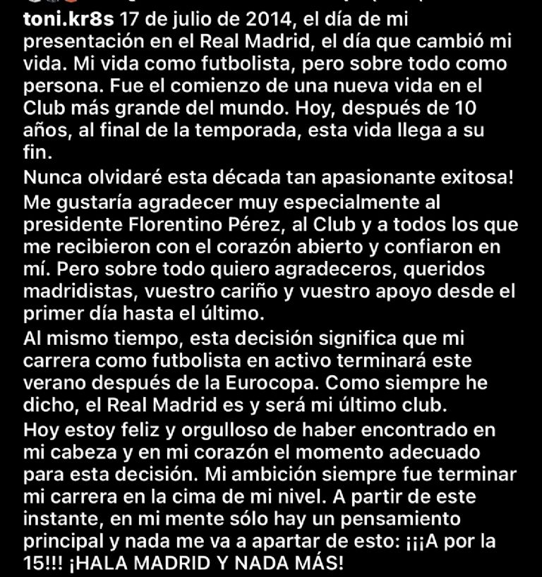 La UEFA Champions League tendrá su gran final el sábado 1 de junio, y uno de los equipo que serán protagonistas será el Real Madrid, quien este miércoles 21 de mayo recibió la noticia de que un jugador y pieza clave de su esquema anuncia su retiro, hablamos del Don Toni Kroos, quien le pondrá punto final a su aventura como futbolista profesional cuando termine la Eurocopa 2024.