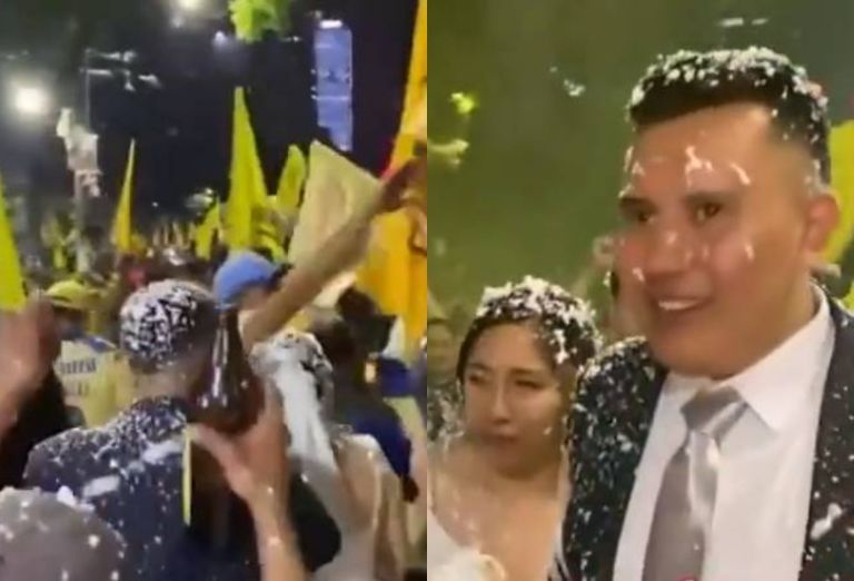 Entre las locuras de los aficionados del América sobresale un hincha que festejó desde el techo del Estadio Azteca, otro cayó de lo más alto de un semáforo, un grupo de personas sacudió una camioneta de la Guardia Nacional y ahora se viralizó una pareja que unió votos el día de la final para después celebrarlo en el Ángel de la Independencia. El peculiar vestuario de matrimonio en medio de playeras amarillas llamó la atención, los recién casados acabaron bañados en espuma.