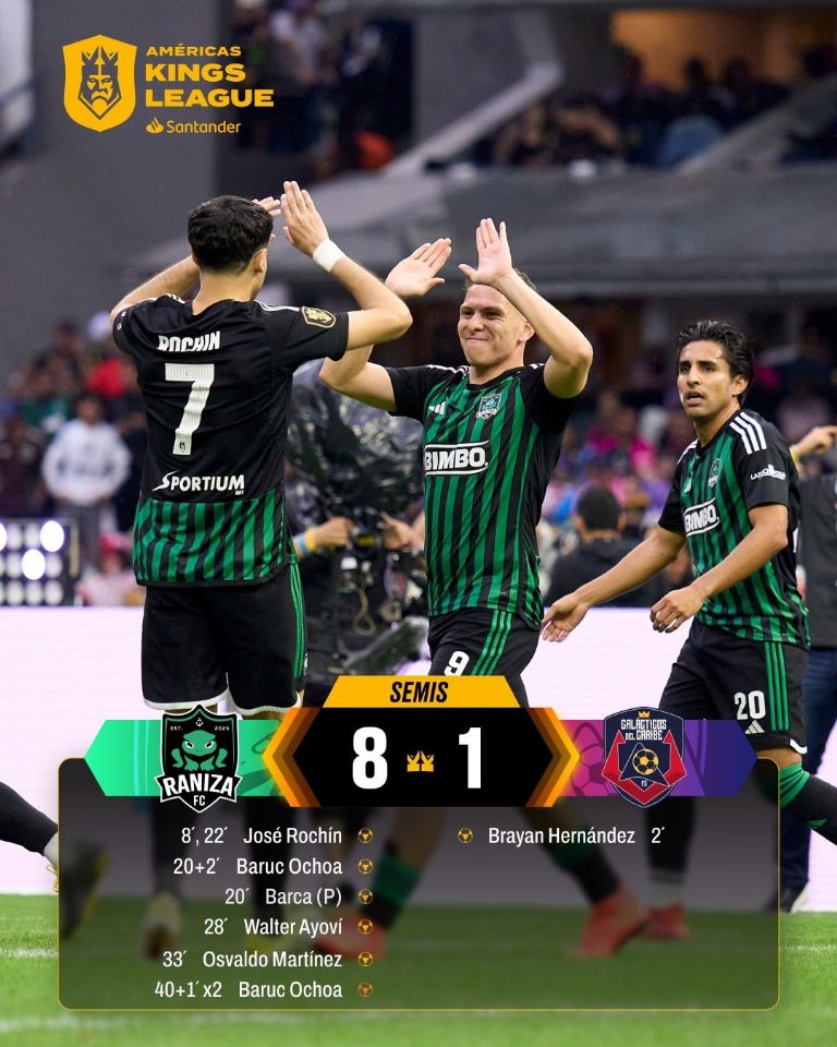 En la primera semifinal de la Kings League Américas entre La Raniza y Galácticos del Caribe, el equipo de República Dominicana se fue al frente gracias al gol de Brayan Hernández, aunque a pesar de tener una penalización de un jugador menos por dos minutos el cuadro dirigido por Severo Meza reaccionó, estableció su dominio en la cancha y logró darle la vuelta al marcador 2-1 al descanso. La segunda mitad fue toda de color verde, con una lluvia de goles de la que sus rivales no pudieron reponerse hasta dejar un contundente 8-1 que los instaló en la final ante el Real Titán.