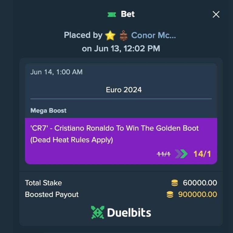 Conor McGregor subió a sus redes sociales una apuesta de 60 mil dólares, poco más de un millón de pesos, a que Cristiano Ronaldo ganará la Bota de Oro en la Eurocopa 2024. Si el Bicho lo logra cobrará 900 mil dólares (alrededor de 16.5 millones de pesos). El excampeón mundial de las artes marciales mixtas tiene un motivo económico para estar atento a lo que haga Portugal durante la competencia continental.