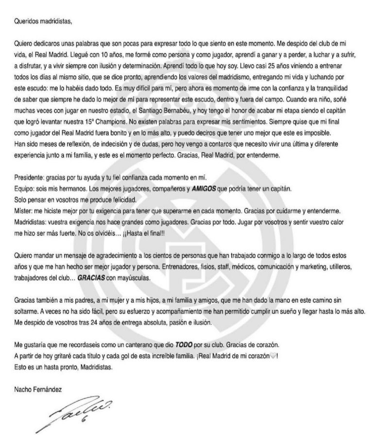 A través de un comunicado que subió Nacho Fernández, el canterano del Real Madrid se despide del conjunto Blanco donde agradece a todo el equipo de la Casa Blanca, y aunque en un inicio parece una triste salida, el mítico 6 Merengue sentencia su adiós con un “hasta pronto”, lo cual puede hacer pensar que, el destino de este jugador podría traerlo de vuelta en un futuro muy cercano.