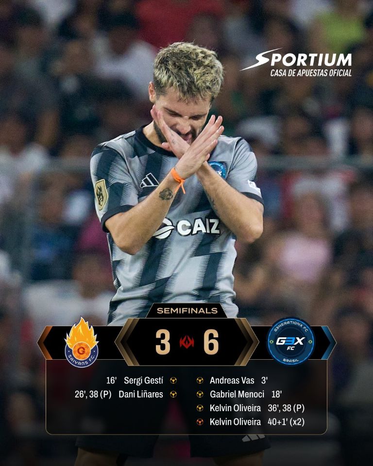 En la segunda semifinal, Andreas Vaz adelantó a G3X al minuto 2, mientras que Saiyans igualó 1-1 con Sergi Gestí y Kelvin Oliveira sirvió para el 2-1 de Gabriel Menoci para los brasileños, aunque la igualada 2-2 no tardó tras una dura falta y penal sobre Lucca Ribeiro que falló Dani Liñares, aunque en la repetición mandada por el árbitro finalmente anotó. Oliveira puso el 3-2 para los de Gaules, mientras Liñares acercó 3-4 para dar paso al gol doble, que el amazónico aprovechó para sorprender a la defensa y al portero para el 6-3 definitivo y que los puso en la final del Mundial de la Kings League ante Porcinos.