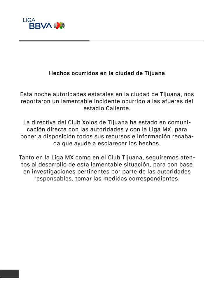 Al enterarse que un aficionado de Xolos había perdido la vida tras ser baleado, tanto la Liga MX como Xolos lamentaron lo ocurrido, emitiendo un comunicado conjunto en el que afirman que "esta noche (viernes), autoridades estatales en la ciudad de Tijuana nos reportaron un lamentable incidente ocurrido a las afueras del Estadio Caliente. Tanto en la Liga MX como en el Club Tijuana seguiremos atentos al desarrollo de esta lamentable situación”, ocurrida tras el partido contra Chivas de la Jornada 2 del Apertura 2024.