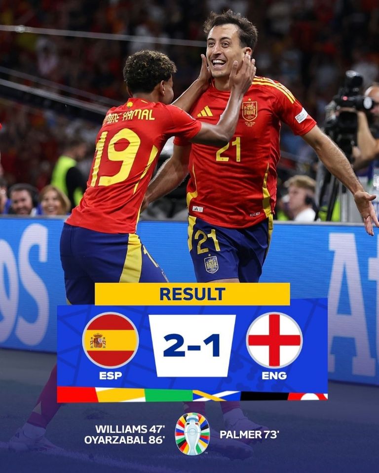 Después de una primera mitad sin emociones, la dupla de Nico Williams y Lamine Yamal se ocupó de abrir el marcador cuando el elemento del Barcelona sirvió para que el futbolista del Athletic definiera con sutileza. Cole Palmer igualó los cartones con un golazo de fuera del área. Cuando los tiempos extra lucían inminentes, Mikel Oyarzabal se convirtió en el héroe menos esperado al anotar el tanto de la victoria. España es el nuevo rey de Europa, mientras Inglaterra ya tiene 58 años sin ganar un título oficial.
