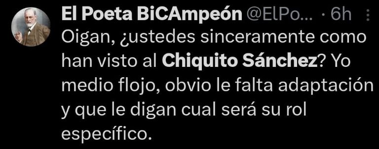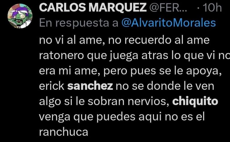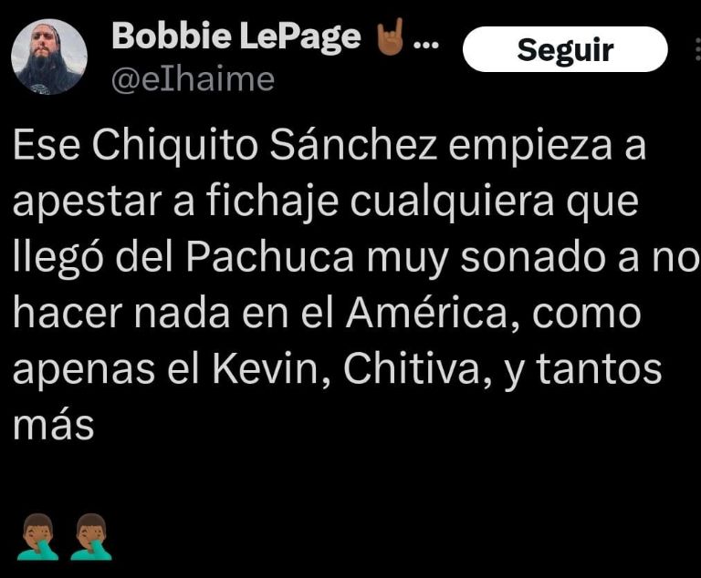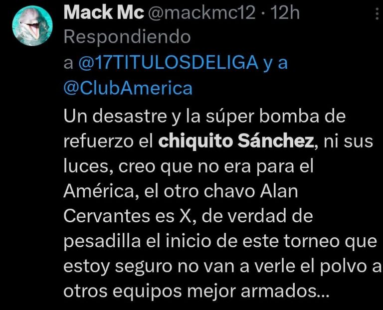 Entre los mensajes que revientan a Chiquito Sánchez en redes están: “Chiquito Sánchez es buen jugador, pero siento que en el América le puede pesar la responsabilidad”, “Chiquito Sánchez me recordó a Ramón Ramírez, le queda tan grande la playera del América que se tropieza con ella”, “la súper bomba de refuerzo el Chiquito Sánchez, ni sus luces, creo que no era para el América” y “¿En qué jornada se le puede empezar a exigir al Chiquito Sánchez?”.