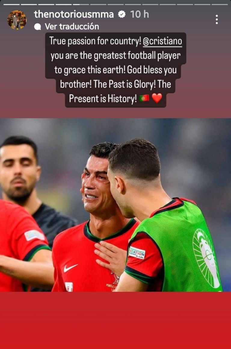 “¡Verdadera pasión por tu país! Cristiano, ¡eres el mejor futbolista que ha pisado la Tierra! ¡Dios te bendiga, hermano! ¡El pasado es gloria, el presente es historia!”, escribió McGregor.