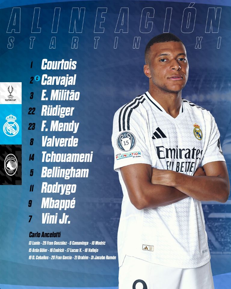 En sus redes sociales Real Madrid no solo compartió su convocatoria para la final de la Super Copa de la UEFA entre el campeón de la Champions League y la Europa League por la supremacía continental, sino también el que sería el cuadro inicial ante el Atalanta, resaltando la presencia como centro delantero de Kylian Mbappé, una imagen que inmediatamente se hizo viral con miles de reacciones y comentarios, todo por el jersey número 9 que levantó ya su primer título como merengue.