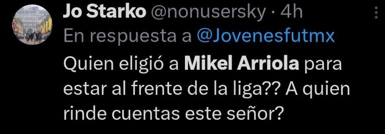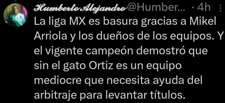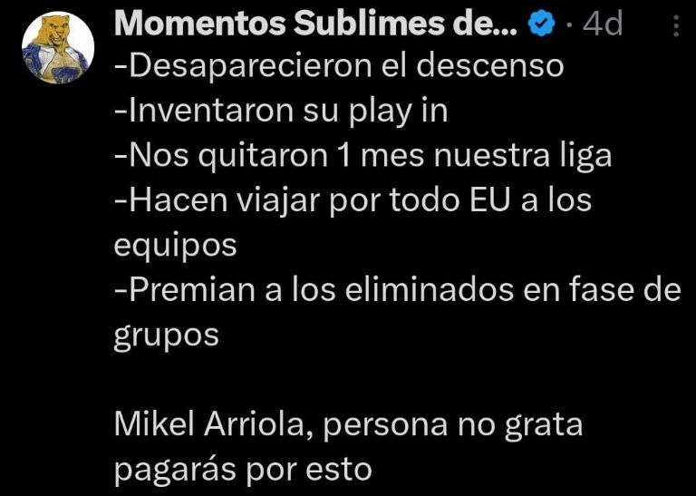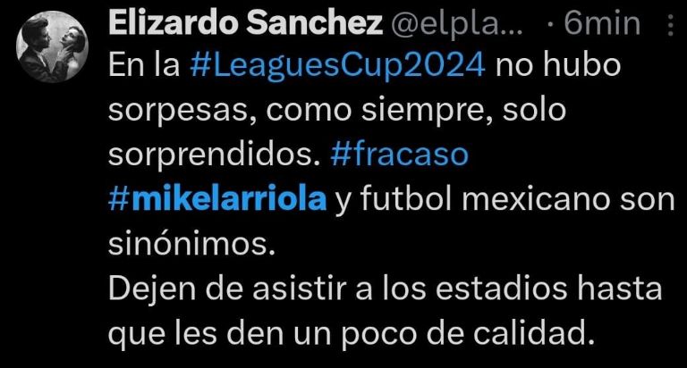 Después de que se consumó la eliminación del América, en redes señales se señaló a Mikel Arriola como el verdadero culpable del fracaso de la Liga MX en la Leagues Cup. Algunos internautas tundieron al presidente del circuito al acusarlo de sólo hacer dinero con este torneo celebrado en los Estados Unidos, donde la mayoría de los clubes mexicanos parte con desventaja al jugar en calidad de visitante.