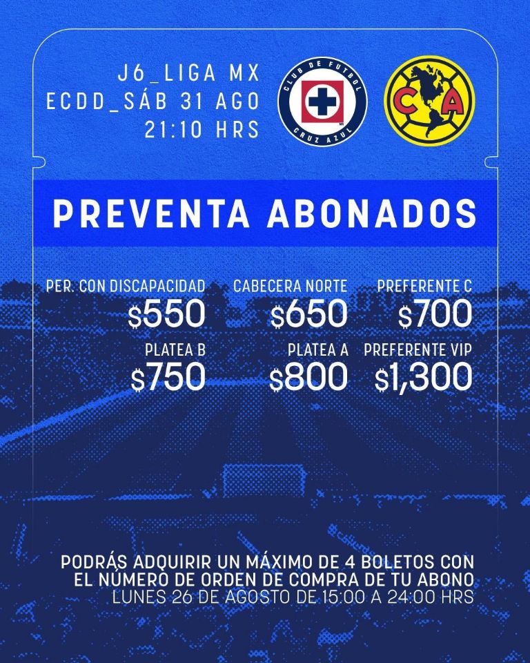 Cruz Azul ya soltó todos los detalles acerca de los boletos para el Clásico Joven, se espera que el Estadio Azulgrana luzca una entrada espectacular y se agoten las más de 36 mil accesos. La venta para los abonados cementeros arrancó el lunes y continuará este martes a través del portal Ticketmaster. La Máquina informó que los interesados con Pase Azul podrán comprar hasta 4 tickets por orden.